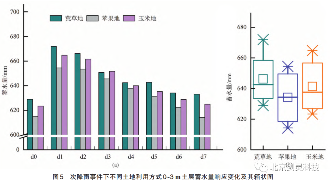 (1)在本次降雨事件发生前及发生后 7 天(降雨量 47.6mm),荒草地、苹果地和玉米地在0~3 m范围内土壤含水量平均含水量分别为 16.13%±1.23%、16.01%±1.38%、16.53%±1.43%。土壤水分对本次降雨事件响应的最大深度由大到小依次是玉米地、苹果地和荒草地,前两者在降雨入渗2天后均出现了最大响应深度下移的现象。采用有序聚类分析将土壤水分纵向变化层次划分为土壤水分活跃带、弱活跃带、相对稳定带,荒草地各层次深度范围分别为 0~0.2、0.2~0.4 和 0.4~3 m,苹果地和玉米地各层次深度范围均为 0~0.2、0.2~0.6 和 0.6~3 m,荒草地土壤水相对稳定带的起始深度小于苹果地和玉米地。
