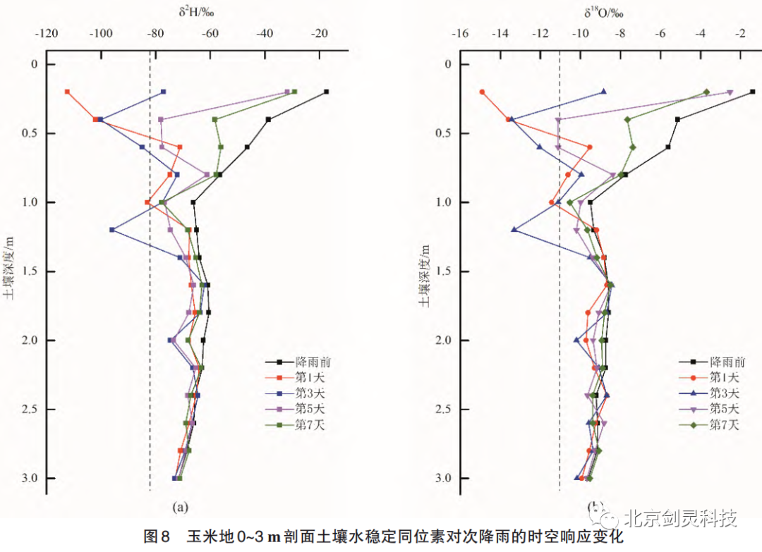 (3)本 次 降 雨 事 件 下 ,雨 水 δ2H、δ18O 分 别 为 -81.30‰、-11.12‰;荒草地、苹果地和玉米地 0~3 m 土层土壤水 δ2H 为( -63.91‰±13.55‰) 、( -65.60‰±14.60‰) 、( -67.52‰±13.32‰),δ18O 平 均 值 分 别(-8.95‰±1.77‰)、(-9.13‰±1.88‰)、(-9.22‰±1.90‰)。
